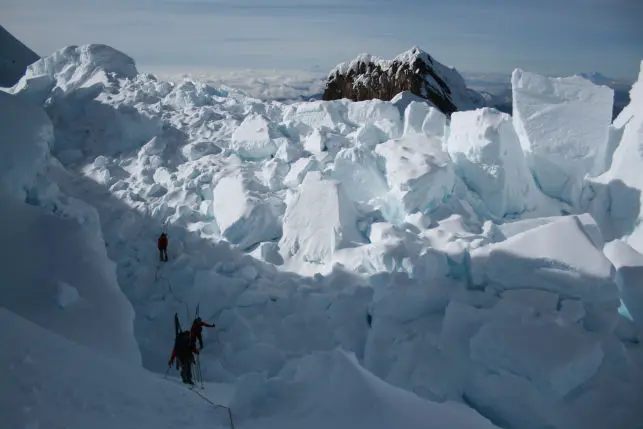 Chimborazo climbing day. Chimborazo is Ecuador’s highest peak and is a massive glaciated volcano that consists of five summits. Rise at midnight for breakfast and equipment check-up. Leave the hut at 1:00 A.M. We move immediately to the huge glacier on Chimborazo’s southwest face where we first traverse moderately angled ice slopes, climb through a series of icefalls and up the steep ice ramps.