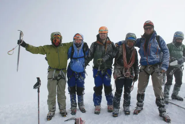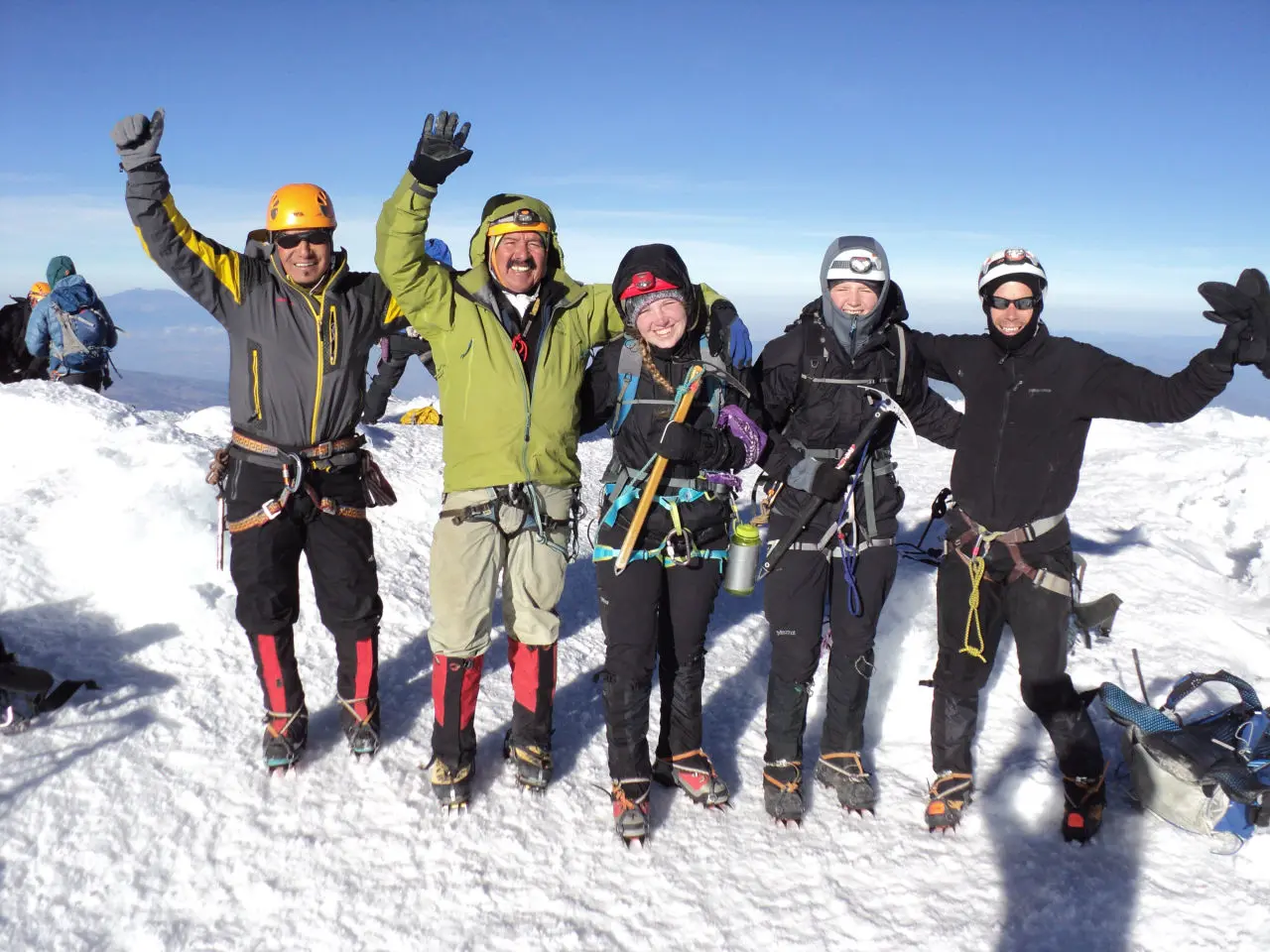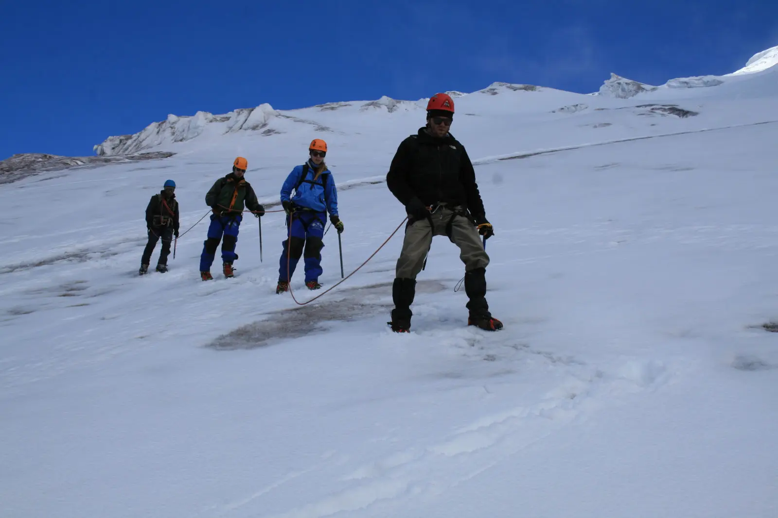 Climbing simultaneously on moderate grounds belaying up the steep pitches. Our team will rope together in order to cross crevasses and finally make it to the summit. This is the highest point of the Andes and from here we have a magnificent view of the emerging volcanoes that form the eastern and western Cordillera.
