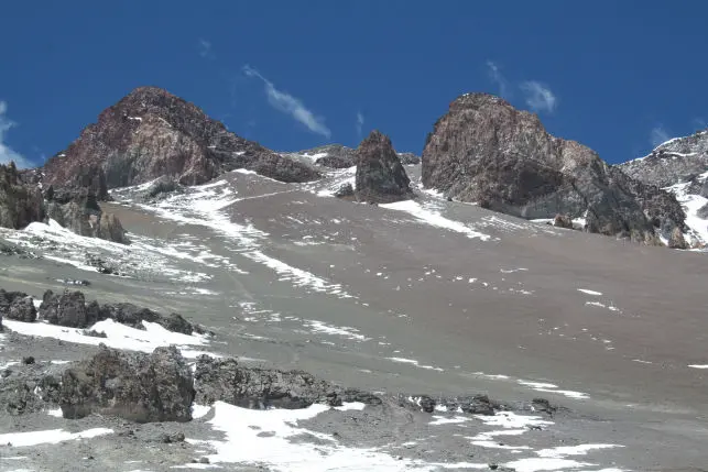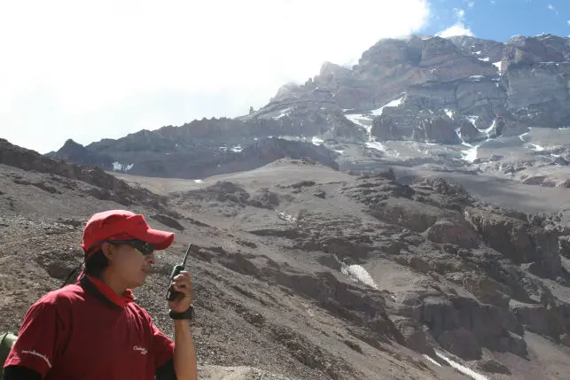 From our base camp in Plaza de Mulas we follow the trail as it gradually suitcase from steep screen slopes to the rock spires that mark Canada Camp at 5,000m (16,500ft). We pass Canada Camp and head up to Nido de Condores, our next camp 1. This usually takes 5-6 hours.